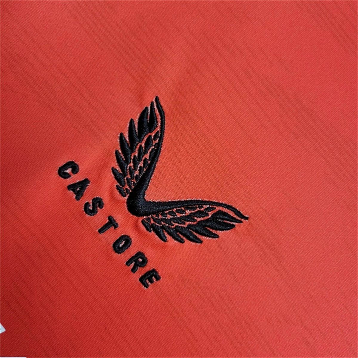 O escudo do Feyenoord está no lado esquerdo do peito, enquanto o logo da Castore aparece no lado direito, em preto. Mesma cor é vista no patrocínio master da Media Market, que estreia esta temporada.