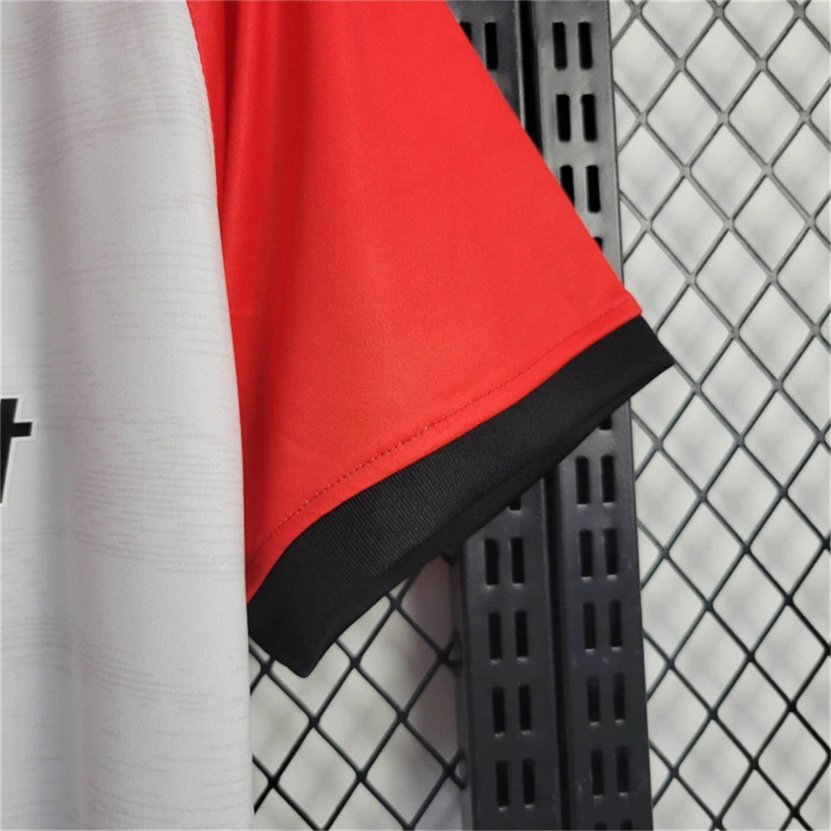 A nova camisa titular do Feyenoord traz o tradicional design meio vermelho, meio branco, onde são vistas texturas com linhas fluídas, que trazem inspiração na água, que está intimamente ligada à cidade de Roterdã.