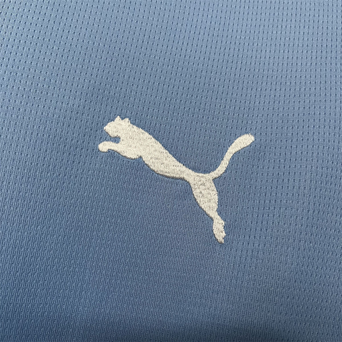 A PUMA estampa o felino em branco, nas mangas e no lado direito do peito, enquanto o escudo do Manchester City vai no lado esquerdo, em sua versão atual padrão.