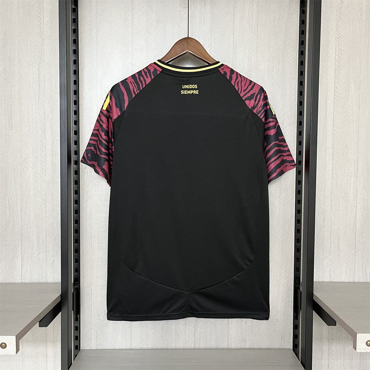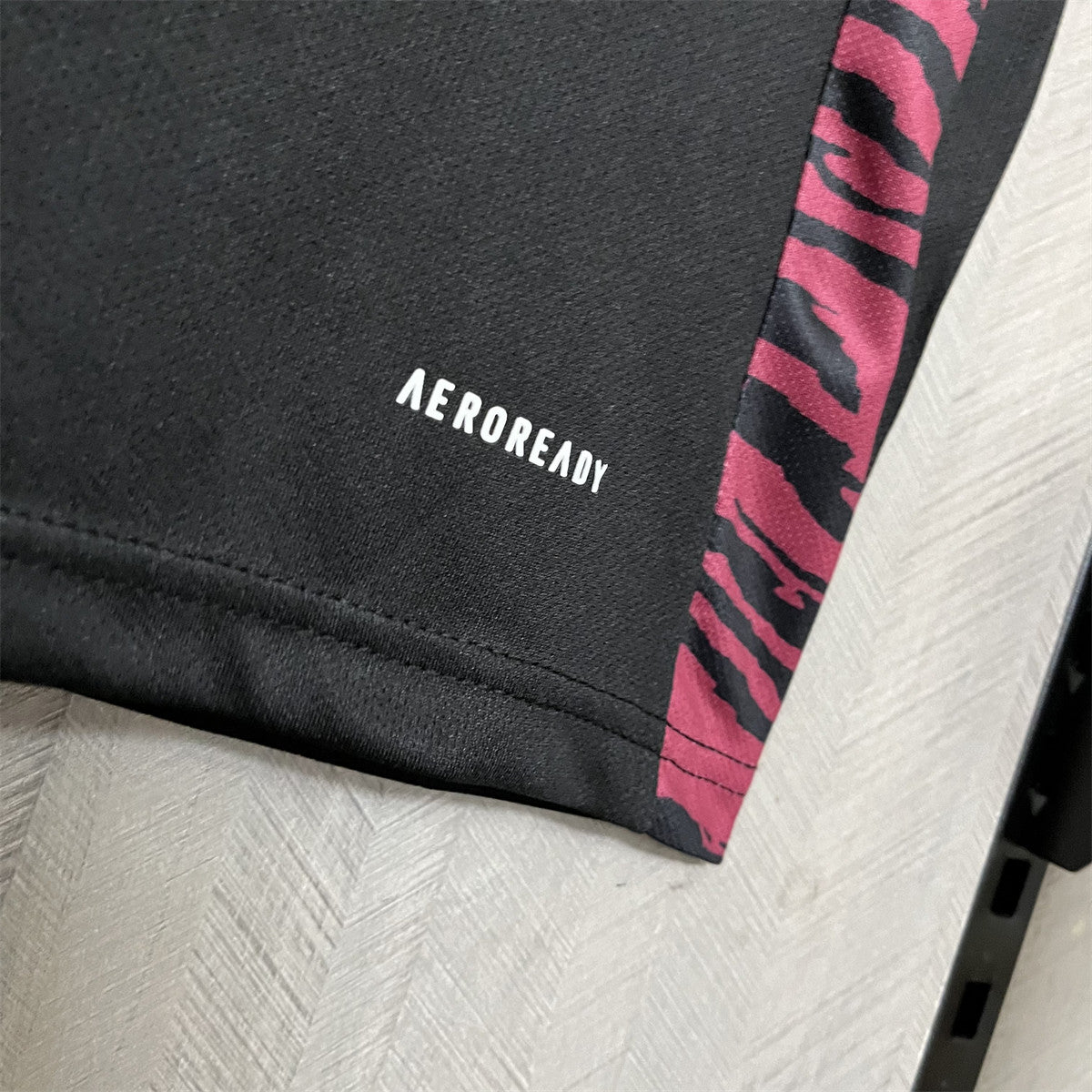 O manto reserva é bem chamativo, com o preto como predominante e apresenta um padrão bem diferente, ondulado, em grená, nas mangas e nos arcos laterais, algo que também foi visto na camisa reserva da Argentina. As três listras nas mangas são novamente douradas.