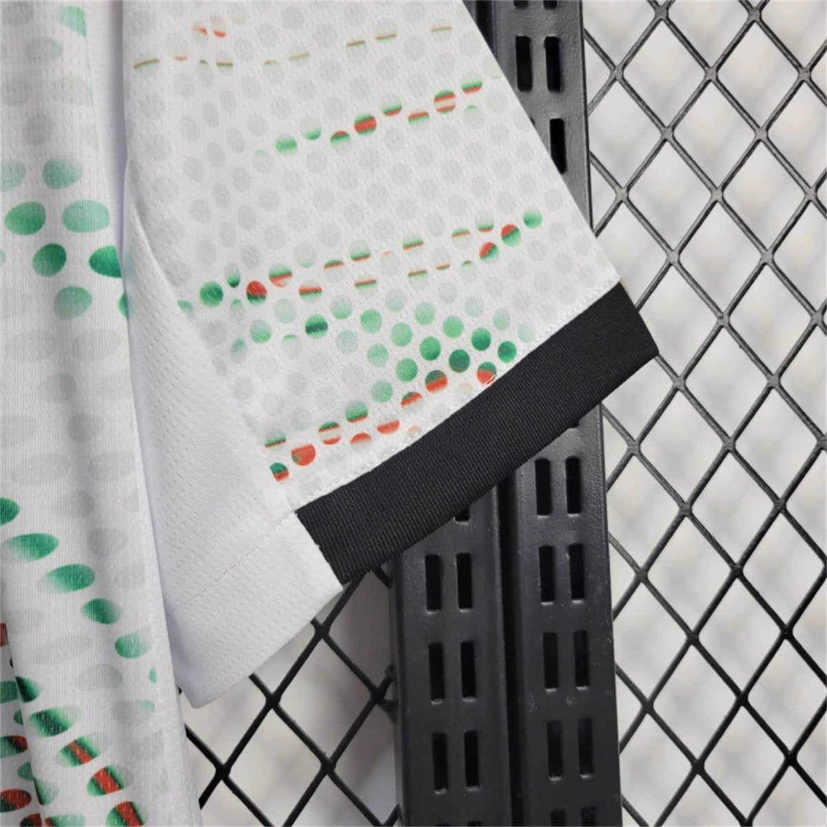 A gola é redonda e traz a frente em preto e a nuca branca, mesmo padrão visto nos punhos.